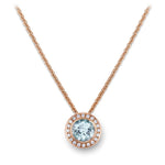 • Red gold necklace with a light blue round aquamarine, 0.67 ct as well as 20 brilliant-cut diamonds totalling 0.07 ct.